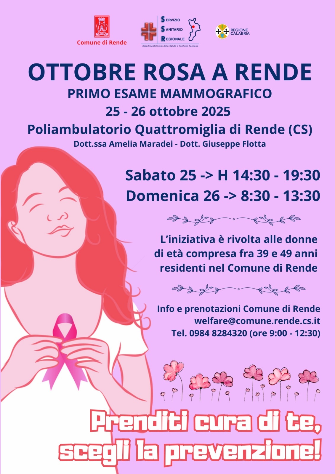 Il Comune di Rende aderisce all’Ottobre rosa con due giornate di sensibilizzazione sull’importanza della prevenzione nella lotta contro il cancro al seno.