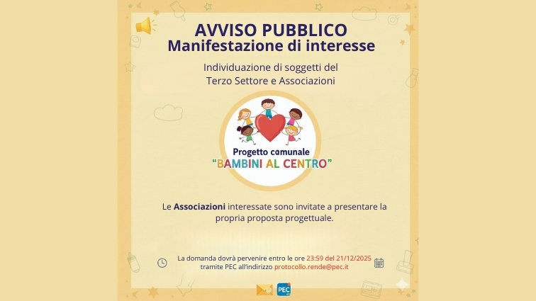 Il Comune di Rende (CS) indice un Avviso Pubblico di Manifestazione di Interesse per l'individuazione di soggetti del Terzo Settore e Associazioni.